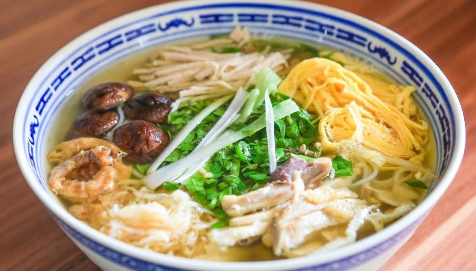 Bun Thang è una zuppa di noodle al pollo preparata con vermicelli, pollo sminuzzato e un assortimento di condimenti come uova, filo di gamberetti e funghi. Questo piatto è leggero e saporito, il che lo rende una scelta popolare per la colazione o il pranzo ad Hanoi.