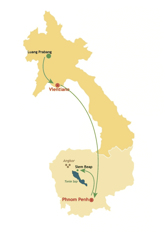 Dal fascino silenzioso delle pagode di Luang Prabang all'atmosfera coloniale di Vientiane, continuerai la tua scoperta dalle ineffabili sentinelle di pietra dei templi Khmer del sito di Angkor, prima di immergerti nel ritmo tropicale della capitale della Cambogia.