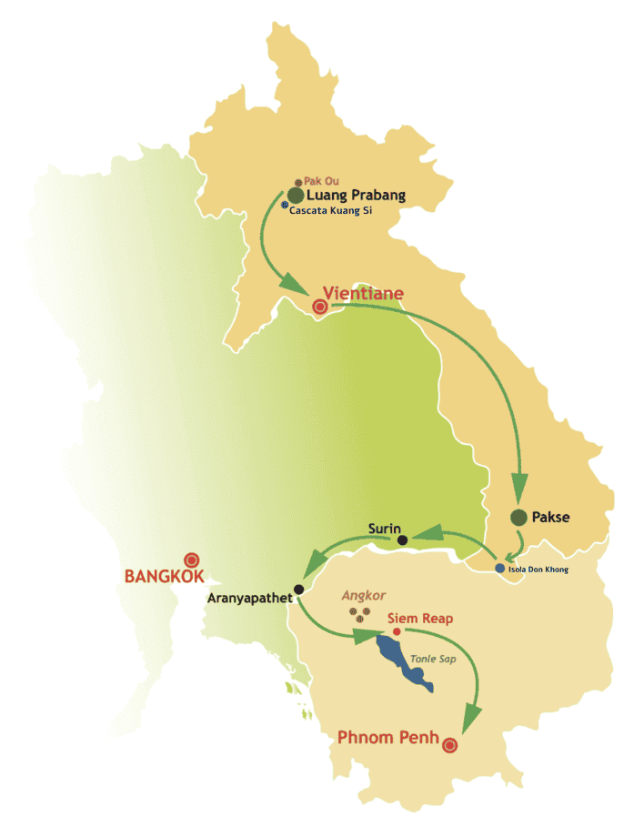 È completamente personalizzabile, il tour unisce la bellezza dei paesaggi montuosi e dei templi di Luang Prabang, la natura selvaggia e cruda delle 4000 isole e l'imponenza dei templi di Angkor.