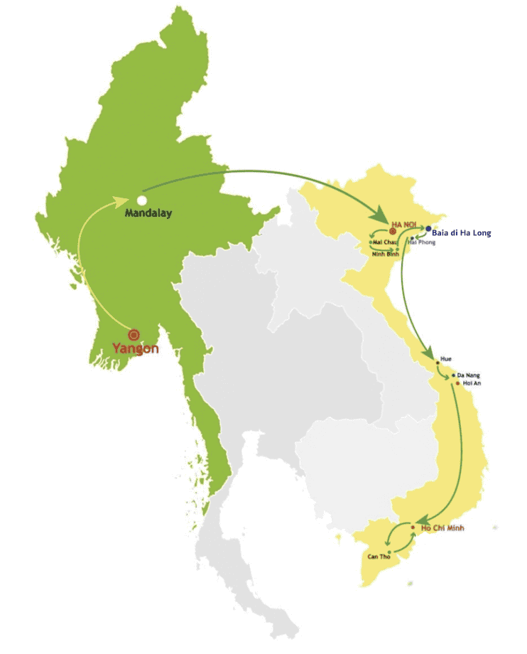 Tour Vietnam Birmania in 16 giorni si propone di farvi scoprire i siti più belli del Vietnam e di immergervi nell'atmosfera mistica del centro della Birmania o del Myanmar. Dai luccicanti templi di Bagan alla Baia di Ha Long passando per il Delta del Mekong, lasciati incantare dalla magia millenaria di queste due antiche civiltà.
